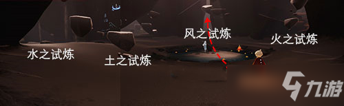 进入洞穴,看到里面有四个关卡,其中蝙蝠面具先祖在第三个里面,即风之试炼中;