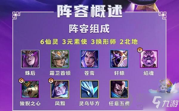 英雄构成 1费:蛛后 2费:霜卫首领 3费:苍鸾、轩辕 4费:焰魂、狻猊之心 5费:凤黯 羁绊构成 6仙灵、3元素使、3换形师、2北地 阵容概述 此阵容核心为仙灵转职的狻猊之心,前中期有金铲铲可考虑此阵容。此阵容主要打的是魔法伤害,需要搭配法系伤害提升的装备打输出。游戏后期,拥有凤黯之后搭配出以6仙灵3换形师为主心骨的体系。 备注:如果没有仙灵转职,需要在8人口补一位换形师,才能凑出3换形师,这种情况下,一般选择上3元素使,也可以选择3约德尔2法师,或者2护卫等。
