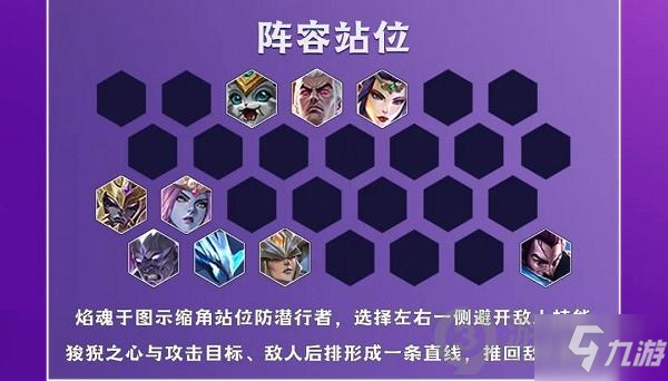 站位分布 要点1:焰魂于图示缩角站位防潜行者,选择左右一侧避开敌人技能。 要点2:狻猊之心与攻击目标、敌人后排形成一条直线,推回敌人后排。 以上便是小编为大家带来的金铲铲之战仙灵换形师阵容搭配了,相信通过这篇文章可以让大家更多的了解到关于金铲铲之战的知识,更多消息和内容关注本站,之后会持续给大家带来更多全新的内容。 >>>查看金铲铲之战攻略大全<<< >>>查看金铲铲之战专题<< |