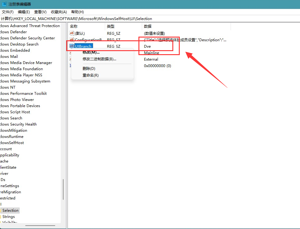 win11系统dev怎么转beta版?相对于win11的dev版本,Beta版比dev版更加的稳定可靠,而且BUG与问题也会更少,但是很多用户不知道怎么从win11的dev版转到beta版,给大家分享一下小方法,一起来看看吧。 win11系统dev怎么转beta版? 1、按Win+R,输入“regedit”打开注册表。 2、在上面的搜索框中输入“计算机\HKEY_LOCAL_MACHINE\SOFTWARE\Microsoft\WindowsSelfHost\UI\Selection”,然后回车定位。 3、最后把Dev数值改为Beta,点击确定即可。 |
