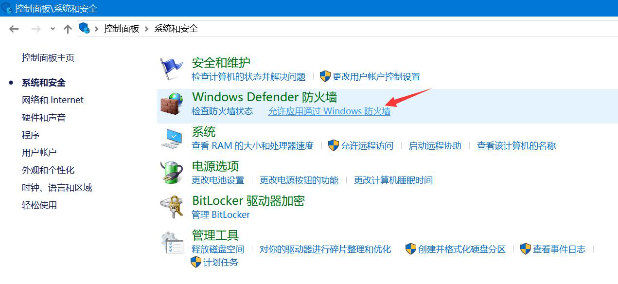 2、在控制面板中,点击“系统和安全”,并在其向导页中,再点击“允许应用通过 Windows 防火墙”。