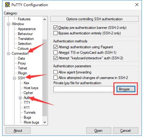 3、之后点击切换至“Connection”下“SSH”目录中的“Auth”功能页,点击“Browse”按钮,选择Putty密钥文件,之后建立连接,下次就可以自动进行登录了。