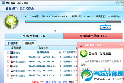 方便用户根据提供的解决方案,通过金山毒霸2011“扫描结果”选项,结合对应的病毒类型和威胁状态,对其进行对应的清除、隔离操作。在扫描过程中,检测到威胁后,金山毒霸2011也会实时弹出安全提醒,告知用户应对威胁加以提防。