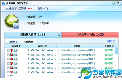 同时,金山毒霸2011还具备极高的病毒检测率,如我们通过各大安全论坛和网友提供的样本素材,整合为一组包括1438个各类病毒在内的检测样本,调用金山毒霸2011对其进行查杀操作,经过扫描,可以看到金山毒霸2011成功检测到1430个安全威胁,病毒检测率高达99.44%,这一检出效果,也可充分验证金山毒霸2011的技术实力,这也是金山毒霸2011能够斩获包括VB100、AV-C等权威国际认证的真实原因。
