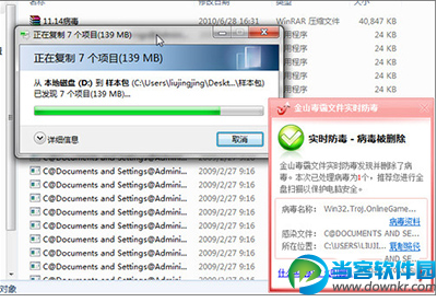 防护模块根据病毒行为,及时判定,已经在检测到存在病毒、木马活动时,金山毒霸2011可在第一时间快速进行安全预警。如在执行病毒样本的解压缩操作、安装包含病毒的可执行文件、传送各类含毒文件和下载包含恶性病毒、木马的文件包等。
