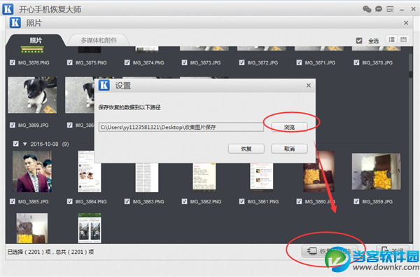 第三步:点击之后,软件开始对照片等相关数据进行扫描分析,扫描时间一般为3-5分钟,具体情况因人而异,会根据手机内存大小而有所不同; 第四步:当扫描分析完成之后,我们就可以在跳出来的页面中预览到那些照片了,在这个界面我们可以看到有“照片”和“多媒体和附件”两个选项卡,包括图片和一些视频文件,我们可以自行预览和查找; 第五步:最后勾选出你想要恢复的那些照片,然后点击右下角的“恢复到电脑”按钮,点击“浏览”选择一个保存路径,就可以将这些照片恢复到电脑上,保存在相应的文件夹了。 这样,即使没有备份文件,也可以直接将苹果手机中删除的照片恢复出来了。当然如果有备份文件的小伙伴们,大家也可以尝试使用开心手机恢复大师的第二第三模式,进行扫描恢复的,可以单独导出苹果手机中删除的数据的,三种模式结合使用可以恢复出更多的数据,希望这篇文章可以帮助到有需要的你们! 以上就是当客小编整理的关于iPhone删除照片恢复方法教程,更多资讯欢迎关注当客下载站 |