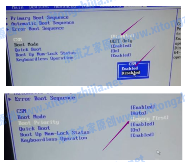 4、按→方向键移动到strat up,选择CSM回车,改成Enabled,Boot Priority改成Legacy First。