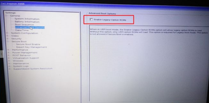 2、Advanced Boot Options,取消勾选Enable Legacy Option ROMs;