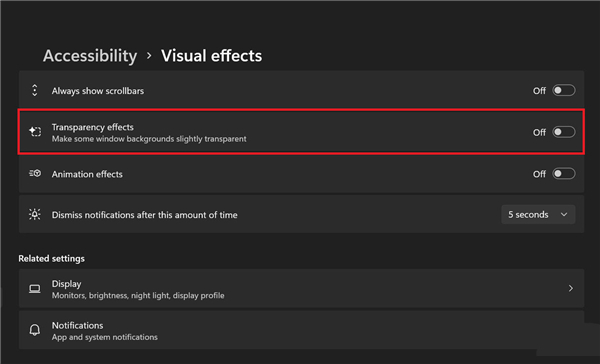 或者,您也可以在 Windows 11 的辅助功能设置中禁用透明效果。为此,请按照以下步骤操作。