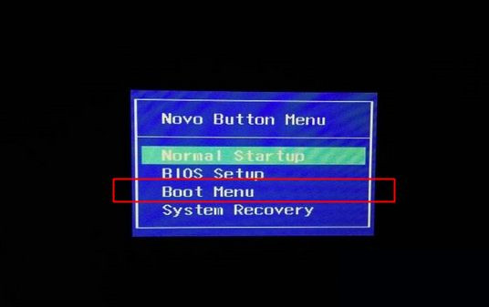 2、此时开机并调出novo button menu,按↓方向键选择Boot Menu,按回车键。