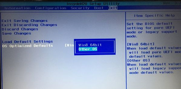 2、进入BIOS设置之后,按→方向键移动到Exit,选择OS Optimized Defaults回车,选择Other OS回车。