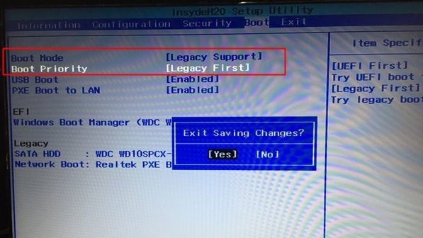 4、转到Boot界面,Boot Mode设置成Legacy Support,Boot Priority设置成Legacy First,USB Boot设置成Enabled,最后按F10或Fn+F10保存重启。
