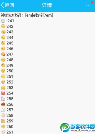 QQ空间神奇的数字怎么玩?小编只想说腾讯会玩,最近小编被小伙伴安利了一波表情包,有没有小伙伴还不是知道qq空间的神器数字是什么?没关系,小编来完整的说一下吧!快来和小编一起看看! 神奇的数字代码转换为表情的预览: QQ空间神器的数字怎么玩? 想要输出神奇的数字,首先小编明说只有QQ空间可以用,这些表情都是没有的,需要自己手动敲代码。而且代码很简单都是[em]e数字[/em],下面是数字表情代码240~283预览: 神奇滴代码: [em]e241[/em] 241 [em]e242[/em] 242 [em]e243[/em] 243 [em]e244[/em] 244 [em]e245[/em] 245 [em]e246[/em] 246 [em]e247[/em] 247 [em]e248[/em] 248 [em]e249[/em] 249 [em]e250[/em] 250 [em]e251[/em] 251 [em]e252[/em] 252 [em]e253[/em] 253 [em]e254[/em] 254 [em]e255[/em] 255 [em]e256[/em] 256 [em]e257[/em] 257 [em]e258[/em] 258 [em]e259[/em] 259 [em]e260[/em] 260 [em]e261[/em] 261 [em]e262[/em] 262 [em]e263[/em] 263 [em]e264[/em] 264 [em]e265[/em] 265 [em]e266[/em] 266 [em]e267[/em] 267 [em]e268[/em] 268 [em]e269[/em] 269 [em]e270[/em] 270 [em]e271[/em] 271 [em]e272[/em] 272 [em]e273[/em] 273 [em]e274[/em] 274 [em]e275[/em] 275 [em]e276[/em] 276 [em]e277[/em] 277 [em]e278[/em] 278 [em]e279[/em] 279 [em]e280[/em] 280 [em]e281[/em] 281 [em]e282[/em] 282 [em]e283[/em] 283 |