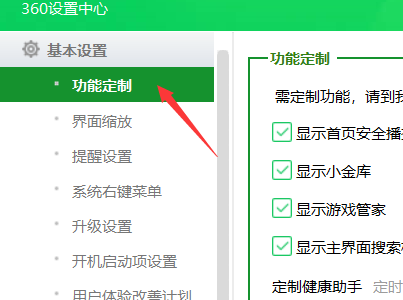 1、打开360安全卫士,找到设置选项。并点击打开,然后在打开的设置界面中,找到功能定制选项,并点击进入。