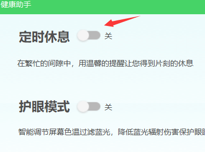 4、在打开的健康助手界面中,找到定时休息选项,并点击打开即可。
