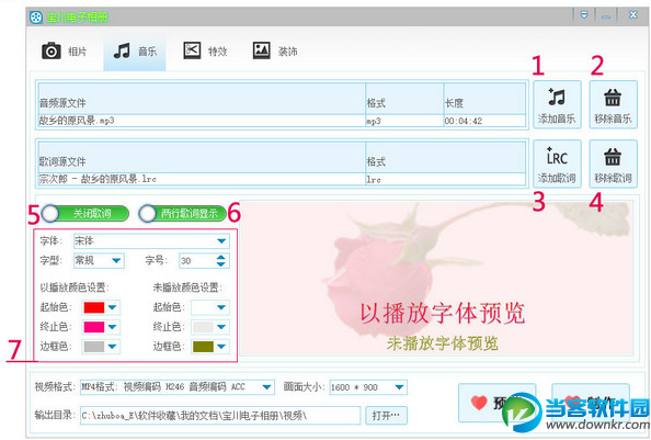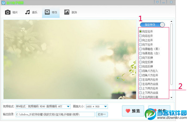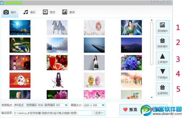 怎么样才能让照片自动播放,又能看起来很有个性呢?电子相册要怎么制作呢?今天当客小编就给大家带来电子制作教程一览,希望对大家有帮助。 宝川电子相册制作教程 使用方法 主界面功能导航 1.相片 添加移除相片,对相片排序。 2.音乐 添加移除音乐歌词,对进行歌词设置。 3.特效 设置切换特效。 4.装饰 添加移除相框水印,对进行标题设置。 注:程序启动后默认选择相片页。 主界面 相片 1.单击后弹出选择框,找到相片储存路径,选择相片后按打开(支持按住鼠标左键+Ctrl多选)。 2.选择左侧相片后,单击移除被选择相片(本操作不会删除用户数据)。 3.选择左侧相片后,单击可对相片排列顺序。 4.选择左侧相片后,单击可对相片排列顺序。 5.单击移除左侧全部相片(本操作不会删除用户数据)。 主界面 音乐 1.单击后弹出选择框,找到音乐储存路径,选择音乐后按打开。 2.单击后移除以添加的音乐(本操作不会删除用户数据)。 3.单击后弹出选择框,找到歌词储存路径,选择歌词后按打开。 4.单击后移除以添加的歌词(本操作不会删除用户数据)。 5.歌词显示开关,要显示歌词请开启。 6.歌词两行开关,开启显示两行歌词,不开启显示一行歌词。 7.设置显示歌词的字体,字体大小,字形,字体颜色。 注:右侧可以实时预览歌词字体显示状态。 主界面 特效 1.特效模式开关,关闭时使用指定特效,开启时随机使用特效(默认为关闭状态)。 2.指定特效选择(特效模式为开启时无效)。 注:左侧可实时预览特效。 主界面 装饰 1.单击后弹出选择框,选择一个相框后按打开(可添加自定义相框必须是PNG格式1920*1080像素)。 2.单击后移除以添加的相框(本操作不会删除用户数据)。 3.相框显示开关(不开启不显示)。 4.单击后弹出选择框,选择一个PNG格式水印相片,按打开。 5.单击后移除以添加的水印(本操作不会删除用户数据)。 6.水印显示开关(不开启不显示)。 7.水印显示位置(水印开关未开启时无效)。 8.视频片头标题显示开关。 9.设置显示标题的字体,字体大小,字形,字体颜色。 注:右侧可以实时预览标题字体显示状态。 主界面 底部设置 1.您可以在下拉列表中选择一个视频编码格式。 2.您可以在下拉列表中选择一个视频画面大小。 3.默认输出目录是在我的文档内,您可以按打开…按钮自定义一个目录。 4.单击打开视频预览界面。 5.单击打开视频制作界面。 视频预览界面 1.单击后开始播放视频(视频画面可能会不流畅,但不会影响输出的视频流畅度)。 注:可以在任何时候关闭本窗口。 视频制作界面 1.单击视频开始制作视频(可能时间会较长请耐心等待,制作视频时请不要运行占用资源过大的程序)。 2.视频制作完成时单击按钮关闭本窗口。 3.单击关闭本窗口(如果您正在制作视频,会询问您是否关闭)。 以上就是当客小编整理的关于宝川电子相册制作的方法教程,更多资讯欢迎关注当客下载站。 |