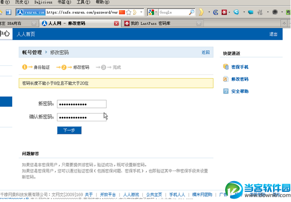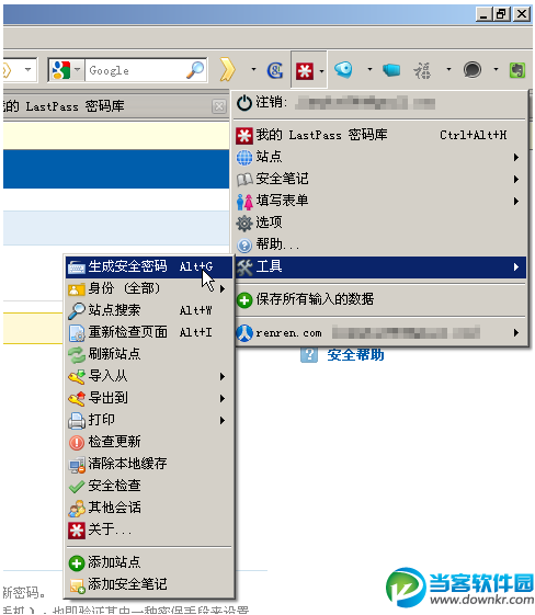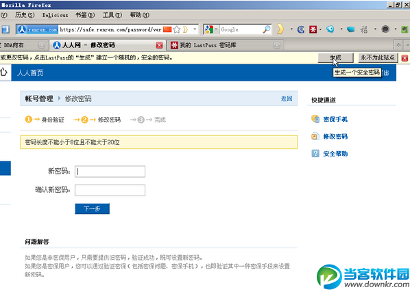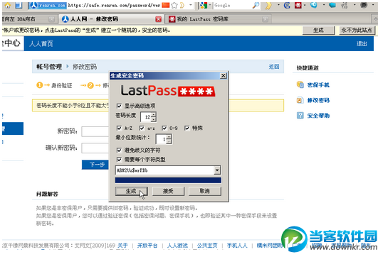ok,我们已经建立了lastpass账户,你只需记住你的主密码,其他的密码交由lastpass来管理即可。如你要建立或者修改你的密码,我可以让lastpass帮我生成一个。我们以修改人人网的密码为例: 你可以选择点击lastpass的插件,选择“工具”-“生成安全密码”: 或者lastpass自动感应到到有需要生成新密码的地方,它会提示一个“生成”按钮,点击: 你可以选择密码的复杂程度,如果不满意当前密码,只需再次点击“生成”,就会生成另外一个,直到你满意为止。 新密码会自动填入到对应的表单中: 注意!!lastpass感应到你是修改密码,会提醒你它之前记录的密码已经被修改成你现在的另外一个,要你确认,此处务必记得按“确认”按钮。