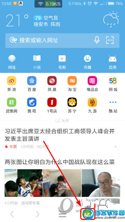 1、打开UC浏览器,点击下方的多页面切换按钮。