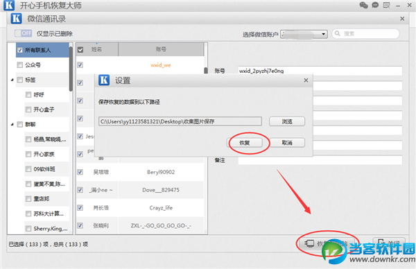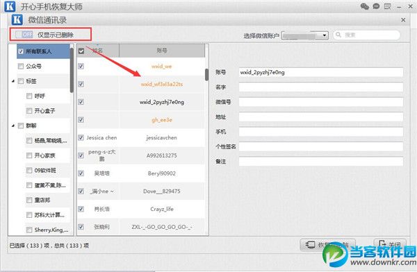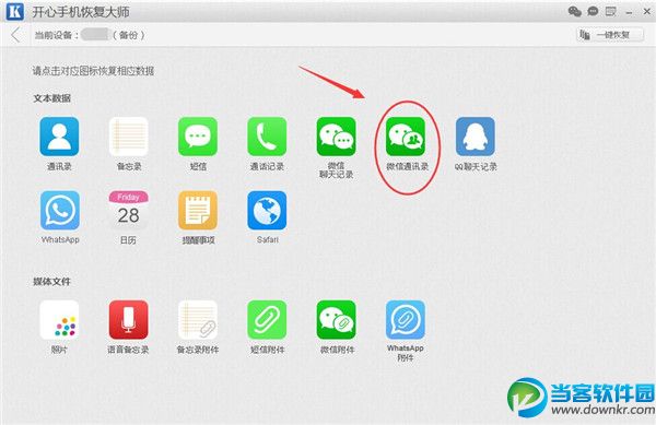 不小心将好友的微信号删除了怎么办,微信好友删除怎么找回?不少朋友在使用微信的时候,会不小心误删了某个好友的微信号,又没有其他的联系方式,这个时候为了不失去与该好友的联系,我们必须将删除的微信号给找回来,那么像这种情况,苹果手机微信通讯录不见了该怎么恢复呢?方法当然是有的,今天当客小编就给大家介绍一个简单快速找回微信号的方法,想知道的小伙伴继续看下文。 恢复苹果手机微信通讯录的具体方法教程: 第一步:在当客下载站下载开心手机恢复大师,并安装到电脑上即可。 第二步:运行开心手机恢复大师,今天我们讲一讲如何通过iTunes备份来恢复微信通讯录,所以,打开软件后,直接点击界面顶端的“通过iTunes备份恢复”,选定需要恢复的备份文件,点击“选定”,然后就进入备份恢复模式了; 第三步:进入到数据项图标恢复界面,我们看到界面上显示的数据,都是软件可以恢复的数据项,由于我们需要恢复的是删除的微信好友,所以现在我们直接点击“微信通讯录”,然后等待软件扫描结果,这个过程一般需要个5分钟左右。 第四步:扫描成功结束之后,将跳转到微信通讯录结果页面,我们就可以看到扫描出来的微信联系人,包括已删除的和未删除的,我们还可以点击上面的“仅显示已删除”进行查找联系人。 第五步:最后勾选出想要恢复的联系人选项,然后点击界面下方的“恢复到电脑”按钮,就可以将你勾选的好友微信号恢复到电脑上了,之后自己可以去默默地加回来,如果对方没有删除你,他那边是不会有提示的哦。 掌握以上的方法,你就可以轻松找回被误删的微信联系人啦,也避免了尴尬。而且开心手机恢复大师除了可以恢复微信好友,还可以恢复微信删除的聊天记录的,包括文字记录和微信图片,语音等文记录的,只需要在图标界面点击“微信聊天记录”或者“微信附件”进行类似操作就可以了,有兴趣的小伙伴可以试试。 以上就是当客小编整理的关于微信好友被删除的恢复方法教程,更多软件教程欢迎关注当客下载站。 |