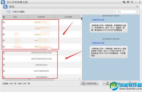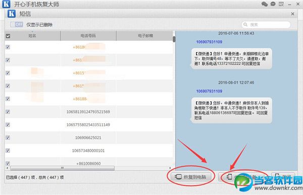 已删除的短信还能恢复吗?前两天在豆瓣上看到网友在询问如何恢复苹果手机上已删除的短信,说不好意思让别人再发一遍,生活中往往会遇到类似的尴尬情景,那么这个时候的关键就是如何恢复误删的短信了,营业厅说目前运营商是不提供这类服务的,因此我们需要借助一下专业的数据恢复软件了,今天小编就给大家推荐一个还不错的苹果手机短信恢复软件,开心手机恢复大师,至于具体的使用教程下面我们一起来看一下。 苹果手机短信恢复教程: 第一步:下载开心手机恢复大师到自己的常用电脑上,下载后安装运行。 第二步:把iPhone连接到电脑上,如果手机是第一次连接到电脑,那么我们需要在手机上进行确认信任电脑的操作。当软件显示“设备已连接”时,说明手机已经正确连接到电脑,然后我们点击“开始”进入数据恢复模式。 第三步:在数据恢复模式,我们可以看到开心手机恢复大师不但可以恢复删除的短信,还能恢复删除的通讯录、微信聊天记录、qq聊天记录等数据。今天教大家的是如何恢复苹果手机删除的短信,所以我们找到“短信”图标,并点击。点击之后,开心手机恢复大师会对手机内的短信数据进行扫描和分析,请耐心等待。 第四步:扫描结束后,开心手机恢复大师进入短信数据的预览界面。在这个界面,我们可以看到手机内已删除的和未删除的短信;其中橙色是已删除的短信,黑色是未删除的短信。 第五步:如果想把短信直接恢复到手机,点击右下角“恢复到设备”,就可以把已删除短信直接恢复到手机的短信列表里,和没删除前一样。如果想把短信导出到电脑查看,选中需要恢复的短信联系人后,点击右下角“恢复到电脑”,就可以把短信导出到电脑查看了。 以上是用开心手机恢复大师的第一模式:“通过设备扫描恢复”,来恢复iPhone删除的短信的详细教程。其实开心手机恢复大师是有三个模式的,我们如果有条件的话,也可以使用第二、第三模式,将iTunes或者iCloud备份中的短信数据给恢复出来。 以上就是当客小编整理的关于苹果手机短信恢复方法教程,更多软件教程欢迎关注当客下载站。 |
