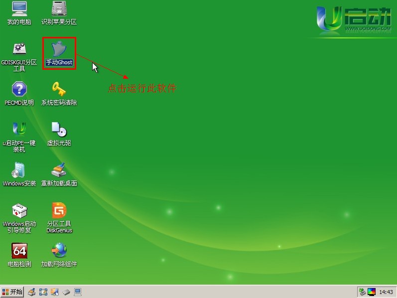进入PE系统后,我们可以手动双击“手动Ghost”运行它,即可!如下图: