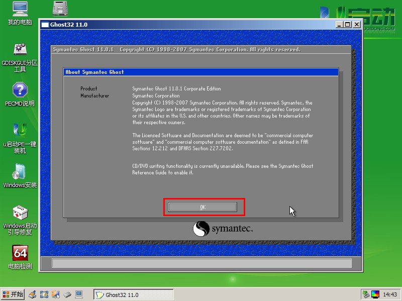 运行“手动Ghost”之后,点击跳出窗口中的“OK”按钮;(系统在线重装)如下图: