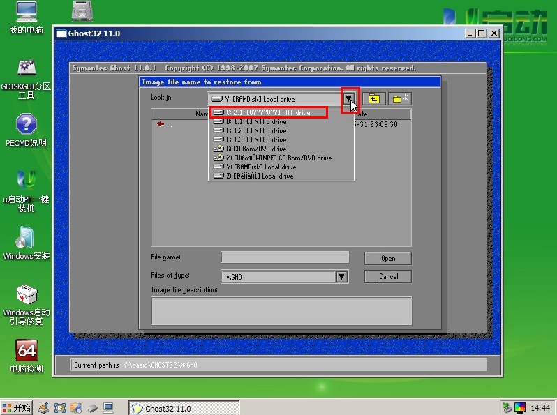 点击上方的红色方框内的三角形符号,在出现的下拉列表中选择您的u盘(若是您没有将下载好的Ghost XP系统复制到u盘里,那么就选择您自己将系统放入的盘中),如下图所示: