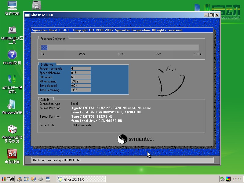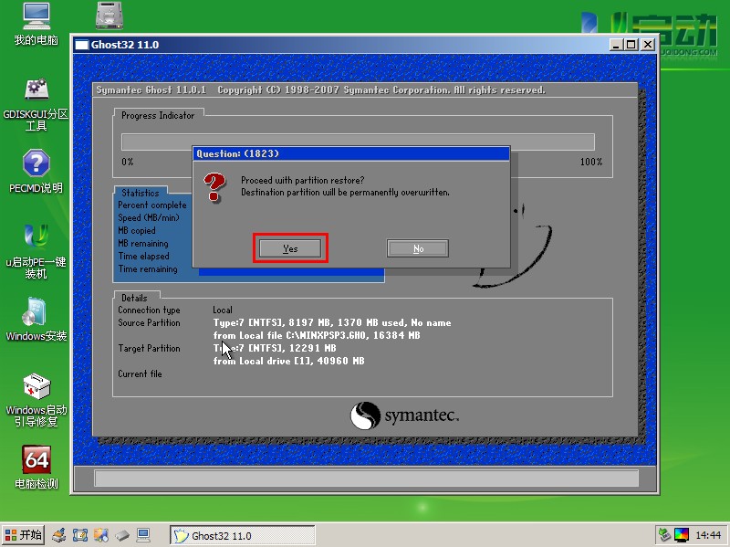 这是个确认框,大概意思就是 你确认对c盘进行恢复操作么。如果选是。C盘的数据将被重置之类的。点击Yes。开始恢复系统,出现百分比进度条,如下图所示: