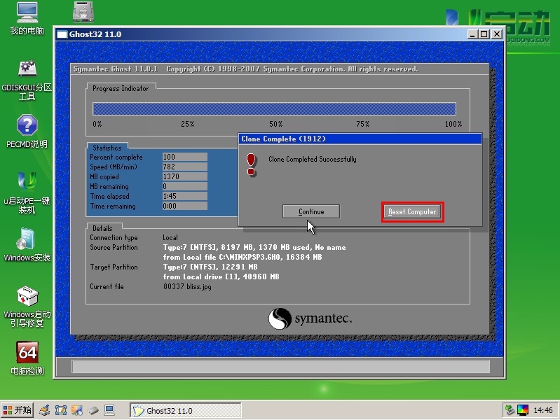 等待进度条完成百分之百后,按照下图提示,点击“Reset Computer”按钮,等待电脑重启,自动安装即可。