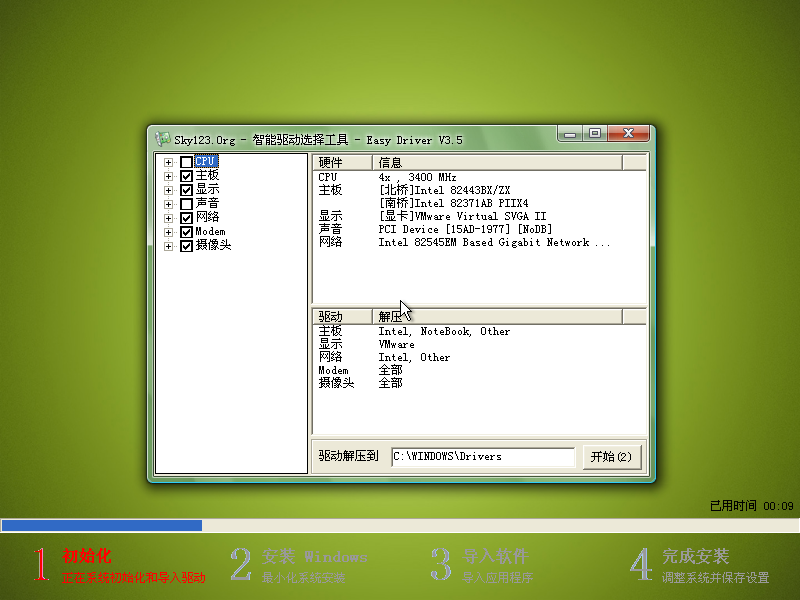 6、Ghost还原过程结束之后,电脑会自动重启,进入系统运行库和驱动安装界面;