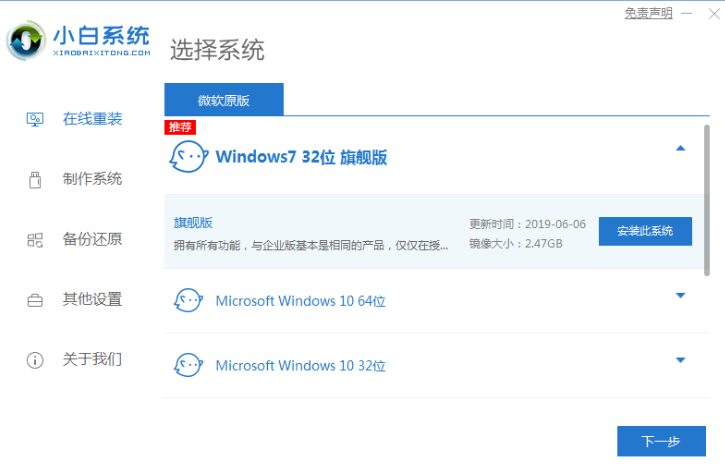 1、在笔记本电脑上下载安装小白一键重装系统工具并打开,选择需要安装的windows系统,点击安装此系统。(注意在安装前,备份好重要资料,关掉电脑上的杀毒软件避免被拦截)