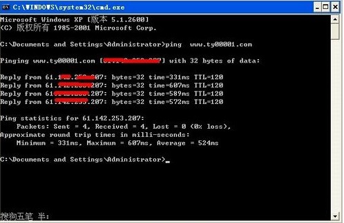 2、 或者大家可以在运行窗口里面输入cmd打开命令提示符窗口后再输入“ping+空格+域名”来进行查询。(此种画面停留时间比较长,不会像第一种查询后窗口就关闭了。)