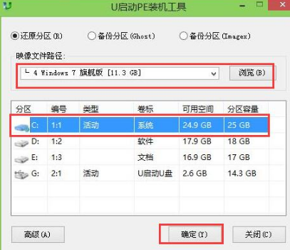 进入pe系统u启动pe装机工具会自动开启并识别u盘中所准备的原版Win7系统镜像,建议参考下图的内容选择系统版本以及磁盘安装分区,操作完成后点击确定: