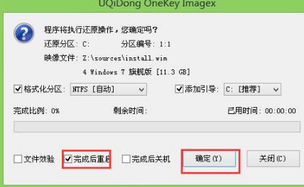 此时弹出的确认提示窗口中,勾选复选框“完成后重启”,接着点击确定,如图: