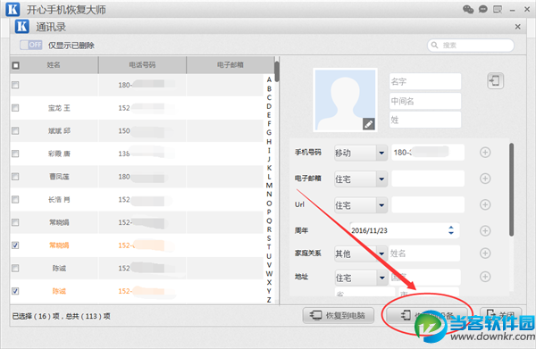 苹果手机通讯录怎么恢复?iPhone联系人怎么找回?在使用苹果手机的过程中,大家总会遇到这样那样的问题,最近小编的手机也是,通讯录突然没了,那么iPhone手机删除的通讯录联系人怎么恢复呢?当我们发现手机通讯录这么重要的数据丢失的时候肯定是十分着急的,那么我们要如何找回iPhone手机丢失的电话号码呢,下面当客小编将给大家分享一个恢复苹果手机通讯录的详细教程,相信对很多小伙伴都是很有用的,有需要的小伙伴自行收藏哦! 找回苹果手机丢失的电话号码的详细方法步骤: 第一步:想要恢复iPhone手机丢失的电话号码,需要在自己的电脑上下载开心手机恢复大师这款软件,然后安装并运行; 第二步:接着连接自己的苹果手机到电脑上,保证数据线稳定可用,连接完成后在软件的主界面上就可以看到有“开始”的按钮,直接点击“开始”就可以进入数据恢复模式; 第三步:这样就默认第一模式:“通过设备扫描恢复”,进入到数据恢复界面了,我们可以看到许多数据项图标,现在只需找到“通讯录”的图标直接点击即可; 第四步:点击之后软件就开始扫描相关数据了,等扫描结束之后,软件就会跳转到通讯录的预览界面,被扫描到的可恢复的电话号码就会呈现出来,其中黑色的是未被删除的通讯录联系人,橙色的则是已删除的通讯录数据; 第五步:扫描到的通讯录可能会很多条,所以我们可以输入关键字进行查找的,我们还可以点击仅显示已删除按钮进行切换查看;最后只要选择需要恢复的通讯录选项,然后点击“恢复到设备”的按钮,就可以将iphone联系人直接恢复到手机里面了。 以上就是iPhone手机联系人恢复指南,想要备份苹果手机通讯录数据的话,也可以下载开心手机恢复大师进行导出备份的,开心手机恢复大师还可以恢复苹果手机误删的短信,微信聊天记录,照片等十几种数据。 以上就是当客小编整理的关于iPhone手机通讯录恢复方法教程,更多软件教程欢迎关注当客下载站。 |