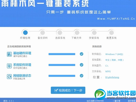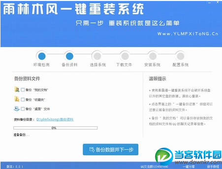 雨林木风一键重装系统是一款免费的电脑重装系统软件,雨林木风一键重装系统让用户无需学习任何电脑操作技术就能自己为电脑重新安装XP、Win7、Win8等操作系统。 雨林木风一键重装系统使用方法教程: 点击下载软件,并正常打开,点击软件首界面的“立刻重装系统”按钮进入检测页面,完成后点击“下一步”。 软件自动检测电脑软硬件环境以及电脑网络连通状态,完成后点击“下一步”按钮 选中要备份的内容,点击”备份“按钮,雨林木风会自动将文件备份到选中的目录下,备份完毕后点击“下一步”。 根据您的电脑配置选择你要安装的系统,点击“安装”按钮,程序会自动进入“下载文件”页面。 文件下载完成之后,点击“下一步”进入安装系统页面。 |