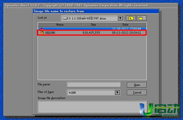 点击上方三角形符号,在出现的下拉列表中选择事先放在u盘中后缀为.gho文件所在的位置后,点击选择.gho文件即可;如下图所示: