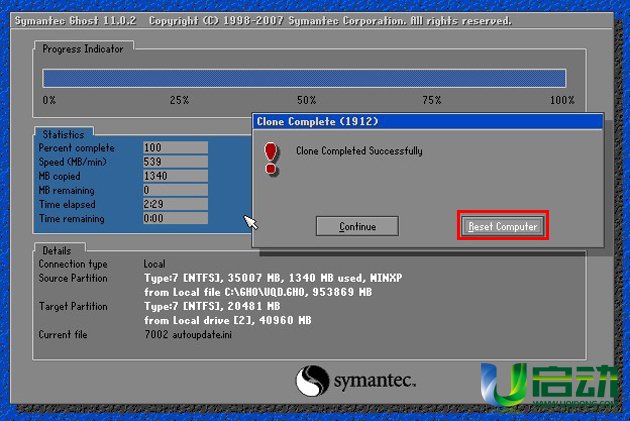 现在我们只需要等待系统自动解压,在出现窗口提示时点击“reset computer”电脑便会自动重启并继续后续的安装。如下图所示:
