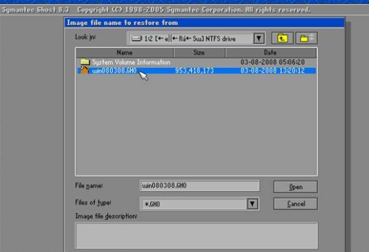 选择备份文件***.GHO,点击“Open”继续。 还原系统图-2