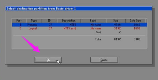 选择目标分区,我们需要恢复第一分区,即系统所在分区。点“OK”继续。 还原图-4