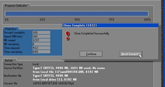 提示系统恢复完成,可以点“Continue”——继续退回到图2的Ghost界面,在此我们点“Reset Computer”重新启动电脑。 一键还原图-7