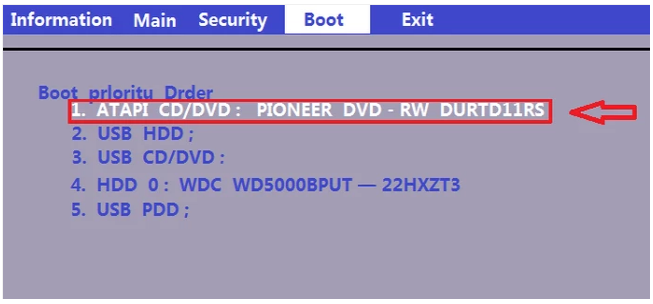 5.按电脑方向键右键,将页面切换到BOOT页,然后按上下键将其移至您希望作为启动位置的U盘,按F5将位置移至第一位,以表明已设置为数据读取地址。