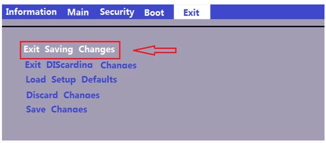 6.然后按右键将页面移至Exit,然后选择ExitSavingChanges,然后按回车键将PC设置为U盘引导。