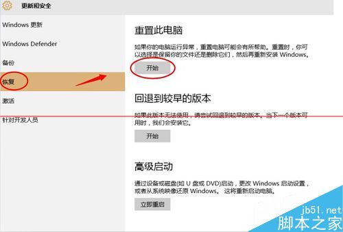 3、在更新和安全中选择”恢复”,然后选择”删除所有内容”,选中