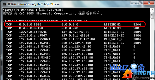 3、然后根据查询的PID找到对应的进程,我么可以看到占有80这个程序的进程ID:5264,继续输入命令【tasklist|findstr "5264"】,5264就是进程ID,现在知道是哪个进程占用的我们就可以采取相应措施进行解决了。 关于查看win7电脑端口是否被占用的技巧就跟大家介绍到这里了,感兴趣的朋友们可以根据上面为大家介绍的方法进行操作哦,相信能够帮助到你们的哦。 |