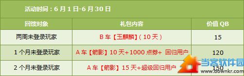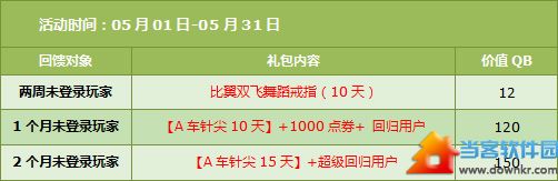 注:仅10级以上玩家可获得回归好礼,且每个玩家只能获得其中一个。 回归点券 拥有【回归用户】道具的玩家,每天完成5局竞速赛,即可获得200点券。 拥有【超级回归用户】道具的玩家,每天完成5局竞速赛,即可获得100点券+200消费券。 回归经验