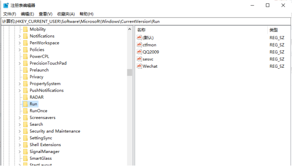 3、接下来在打开的注册表编辑器窗口中定位到计算机\HKEY_CURRENT_USER\Software\Microsoft\Windows\CurrentVersion\Run