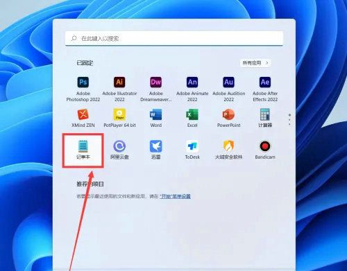 1、鼠标点击任务栏中的【开始菜单】,再点击打开【记事本】。