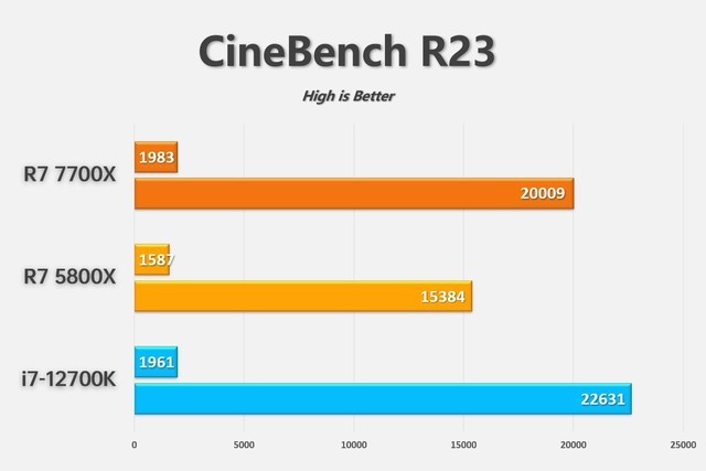 CINEBENCH R23 算是之前R20的小改版吧,为Cinema 4D利用多个CPU核心的性能提供了更准确的测量,会用到少量的AVX指令,主要还是已SSE为主。Cinebench R23相比R15能更好的利用到多核的性能,12700K更多的核心/线程让它在这个项目中得分超过了7700X。