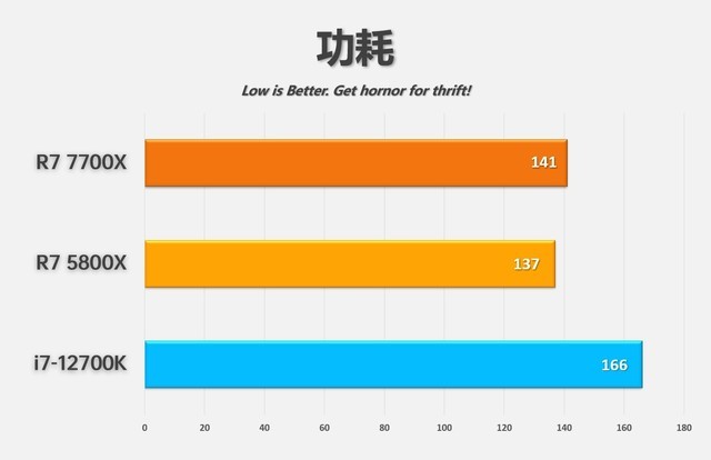 室温21℃的房间,单烤FPU 大约5分钟左右,测试3者的功耗/温度表现,让我非常惊讶的是,7700X相比5800X的功耗几乎没怎么提升,虽然温度提升挺多的,IPC提升还是挺大的。7700X只用了12700K 85%的功耗就达到了和12700K五五开性能。